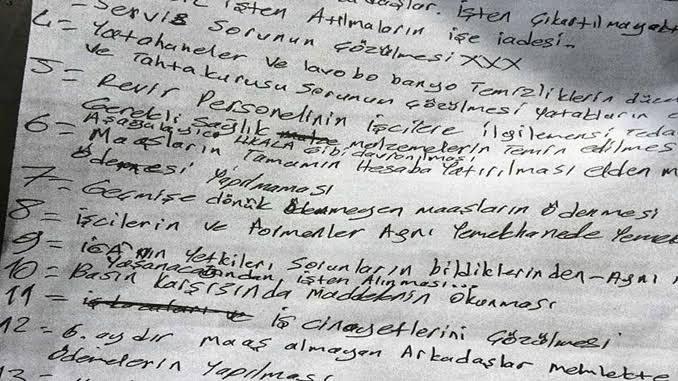 Eğitim seviyesi ortalamanın altında birisi tarafından kaleme alındığı düşünülen bu el yazısı talepler listesi, AKP’li iktidarının yüz karası niteliğinde tarihe bırakılan çok önemli bir belgedir. Vicdanını tümden yitirmemiş bir ‘İNSAN’ın okuduğunda sarsılmaması mümkün değil. Talepler 19. Yüzyılda hak mücadelesi veren işçilerinin beklentileri düzeyinde. İnsan gibi yaşama ve en temel çalışma koşulları dışında talepleri olmayan bu işçiler insani değerlerden nasibini almamış yalaka, onursuz ve yandaş medya tarafından önce küçümsendi, sonra hedefe kondu.