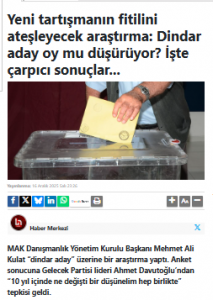 - Mehmet Ali Kulat’ın MAK Danışmanlık şirketinin yaptığı bir araştırmada insanlara “iki adaydan birinin rakip adaya göre daha dindar olması siyasi tercihlerinizi olumlu anlamda ne düzeyde etkiler?” diye (10 yıl ara ile 2 kez) soruluyor. Verilen yanıtlarda “çok etkiler+ etkiler” diyenlerin oranı on yıl önce yüzde 62 iken bugün bu oran yüzde 31’e düşmüş. Görülüyor ki dindar aday profili seçmenin siyasi tercihlerini eskisi kadar etkileyemiyor. Bu gerçeği siyasal iktidar da çok iyi görmüş olmalı ki Bilal Erdoğan konuya el atmış.