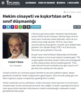 Çalışanların temel hak ve özgürlüklerinden çok sadece aldığı hizmete bakan insanlar, güvenli ve nitelikli sağlık hakkı için eylem yapan doktorlara düşmanlaştırılıyor. Sadece bunlara bakınca bile bu hekim cinayetinin rastlantı sayılamayacağı, hazırlanmış bir politik sürecin yarattığı ve beklenen bir sonuç olduğu görülmüyor mu?