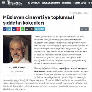 Bu olay değerlendirilirken, yaşadığımız sosyal ve siyasal iklimin rolü hesaba katılmadan yapılacak tahliller hep eksik kalacaktır. Sanata ve iyiliklere sahip çıkılmadığı, psikolojik ve fiziksel vandallığın önünün iyice açıldığı, bir kesim için cezasızlığın yaygınlaştığı bir dönem yaşıyoruz. Bu olayın failleri kendilerini herkesten üstün gören, siyasal dönemin yüreklendirdiği şımarık, vicdansız, empati yoksunu yoz kültürün nihai ürünleridir. Bu katillerin cüretkârlığında, nefretin her alanda yükseltildiği toplumsal ortamın etkisi de sorgulanmalıdır.