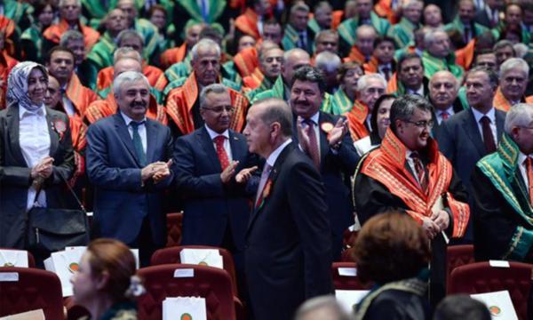 Yine örneğin; Yargı kurumu en alttan en üste kadar tam kontrol altına alındığı halde, bunlar olmamış ve Yargı “bağımsızmış” gibi gösterilmek adına, adli yıl açılış töreni asıl olması gereken mekânda, yani 2016’ya kadar olduğu gibi Yargıtay toplantı salonunda yapılabilir ve Cumhurbaşkanı da bu törene iştirak eder. Ama böyle olmuyor, hepsini Saray’ına çağırıyor.